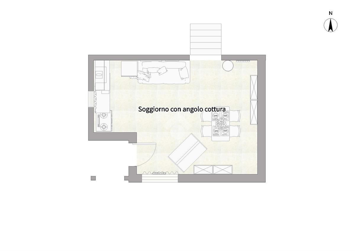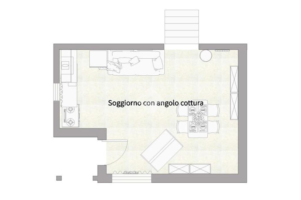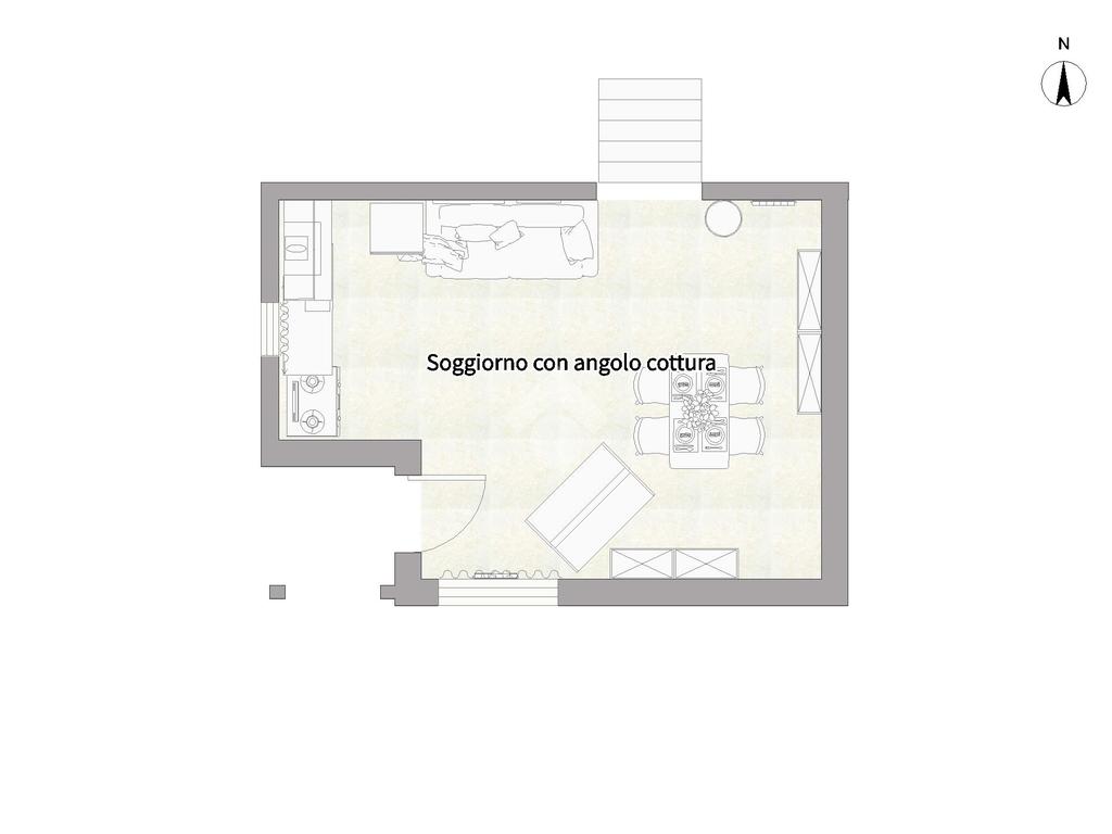 L'area living è composta da un soggiorno con angolo cottura, funzionale e ben organizzato, perfetto anche per ospitare un divano letto per gli amici o i turisti. Pochi scalini interni conducono alla zona notte rialzata, un nido accogliente che ospita una spaziosa camera matrimoniale e un bagno finestrato con doccia, rifinito con cura.