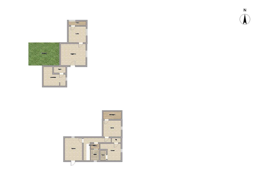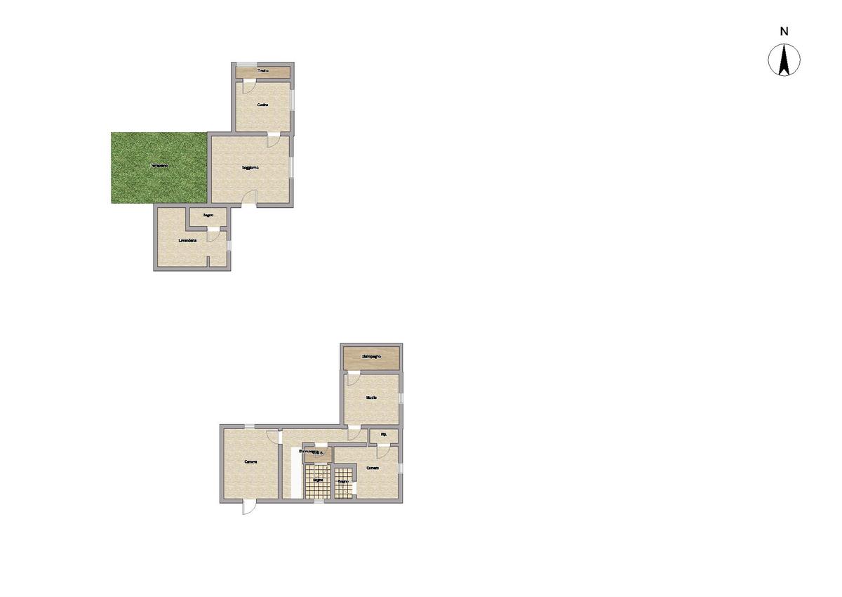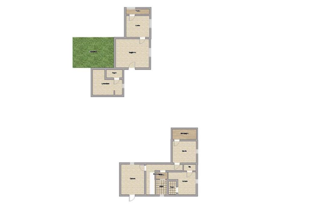 Al piano terra troviamo: un tinello accogliente, una cucina spaziosa, un soggiorno luminoso, un ampio terrapieno ideale per rilassarsi all’aperto, una lavanderia ben organizzata e un bagno comodo. Il primo piano ospita uno studio versatile, un disimpegno funzionale, un ripostiglio, due camere da letto spaziose e due bagni, di cui uno completo di anti-bagno.